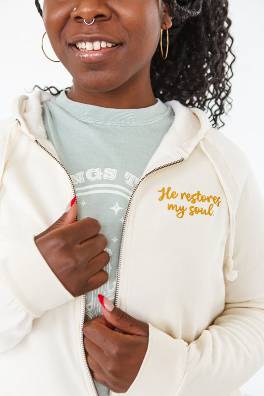 This neutral lightweight hoodie is the perfect transitional piece. Lightweight and comfortable, featuring a full zipper in the front. Featuring the text, "he restores my soul" on the left pocket area, and the verse Psalm 23:3-6 spanning the back of the sweatshirt in a beautiful script text. This sweatshirt fits true to size, length hits around the hips.