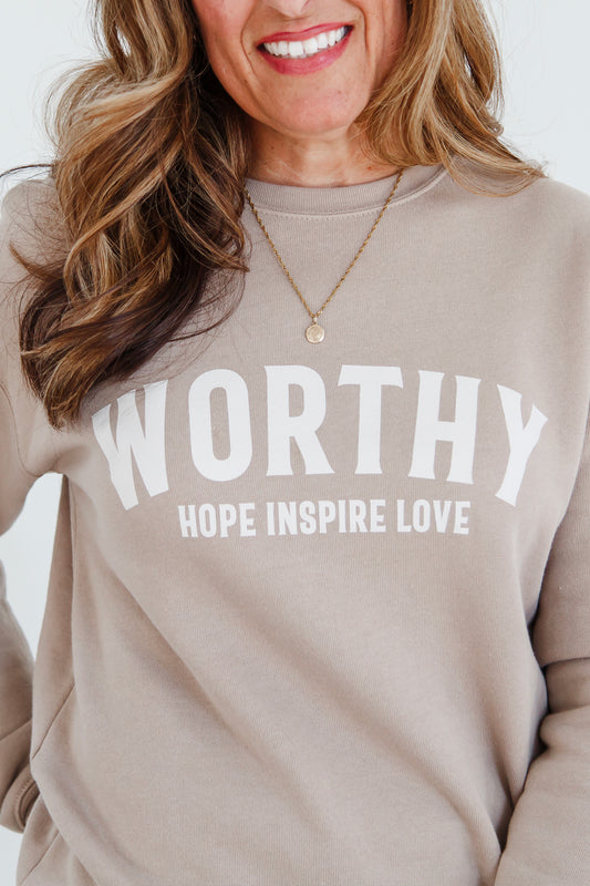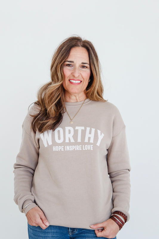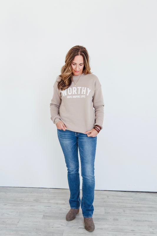 The tan WORTHY sweatshirt is soft as butter and is pre shrunk! Never forget you are WORTHY.