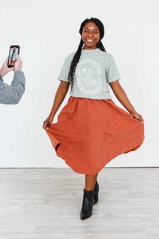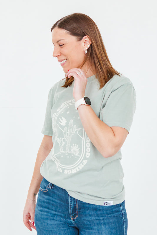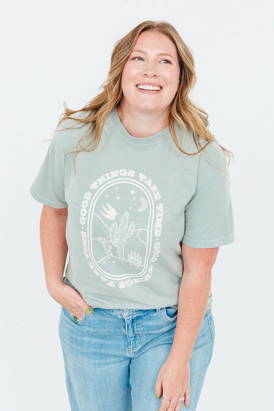 This new design is the perfect reminder, as we wait patiently for the Lord to provide. Printed on a heavyweight Comfort Colors short sleeve tee, in a gorgeous sage color. Featuring a cool desert design with the words "Good Things Take Time" printed around the graphic. This style tee is perfect to wear oversized or more fitted, whichever you prefer.