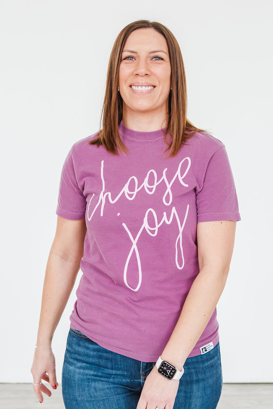 This new tee features the phrase "Choose Joy", a great reminder to always be joyful. Printed on a mauve heavyweight Comfort colors tee. The fit is looser through the shoulders, more fitted around the hips. True to size for a comfortable fit, size up for an oversized look. Purchase our kid's "Choose Joy" tee to match with your kiddos!