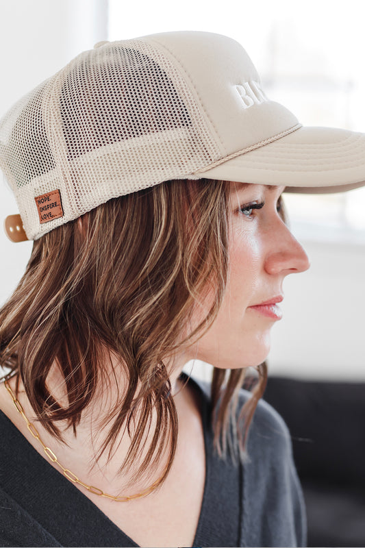 Our Blessed hat is the perfect neutral piece for the changing seasons. "Blessed" is embroidered in white, on a tan, puffy style trucker hat.