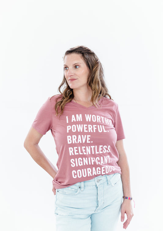 Wear this powerful t-shirt proudly! This beautiful mauve t-shirt has a relaxed fit and is soft to the touch. It features a V-neck and short sleeves. Front imprint in white says: I Am Worthy. Powerful. Brave. Relentless. Significant. Courageous.